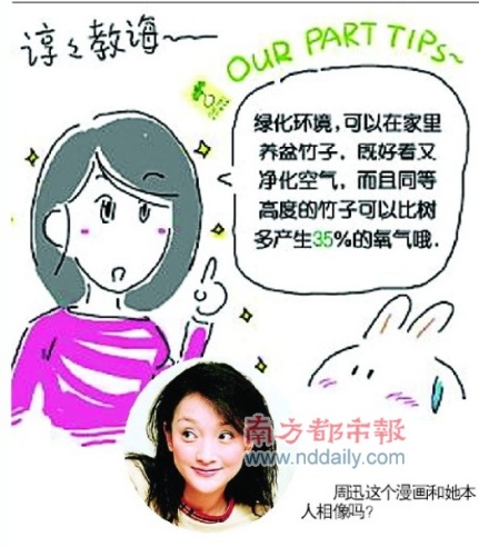 周迅日前推出“周粥”合作———和國(guó)內(nèi)當(dāng)紅漫畫家胖兔子粥粥合作漫畫專欄,推廣環(huán)保意識(shí)。