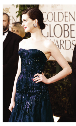 雖然沒有領到“金球”,但是安妮·海瑟薇在紅地毯上分外搶眼,鑲有藍色寶石的孔雀型耳環(huán)與寶石藍金絲裹胸禮服相得益彰!