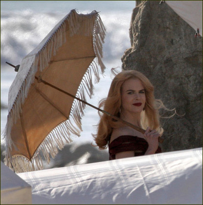 妮可·基德曼2月19日在洛杉磯的某海灘上為某雜志拍攝宣傳寫真,當(dāng)天的妮可·基德曼化身中世紀(jì)的貴婦,穿著暗紅色的絕美長裙,襯得身材玲瓏,肌膚透白,手中的陽傘更是增添了高貴優(yōu)雅,和妮可·基德曼得天獨(dú)厚的氣質(zhì)完全符合。