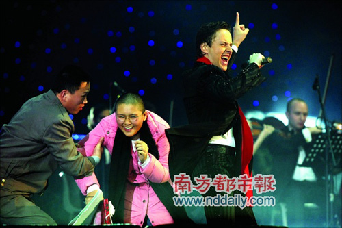 上周六晚,俄羅斯神奇的男高音Vitas第二次來(lái)到廣州開唱。當(dāng)晚,高到男女莫辨的聲音響徹廣州新體育館,寒冷的空氣中人群沸騰。《星星》、《歌劇2》、《第五元素》等挑戰(zhàn)人類聲音極限的歌曲得到了觀眾最熱烈的歡呼。Vitas第二次來(lái)廣州也放開膽量走進(jìn)了瘋狂的觀眾席,成功引起場(chǎng)內(nèi)人流洶涌,滿場(chǎng)騷動(dòng)。也正因?yàn)楦杳詡兲?dòng),讓此番Vitas廣州、深圳兩場(chǎng)演唱會(huì)充滿驚險(xiǎn)。被歌迷摸臉、強(qiáng)吻、拉倒的場(chǎng)景屢次出現(xiàn),甚至還有獻(xiàn)花女粉絲當(dāng)場(chǎng)暈倒在舞臺(tái)上,讓一直保持迷人微笑的Vitas都手足無(wú)措。