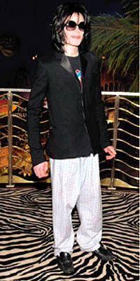 杰克遜近年飽受不利消息困擾,被指周身債之余,唱片銷量也大縮水,不過并沒有影響他慶祝50大壽的心情。上周四他現(xiàn)身賭城Planet Hollywood餐廳,與11歲兒子Prince Michael、10歲女兒Paris及6歲幼子Blanket一起吃晚飯,當(dāng)日杰克遜心情甚佳,對記者面露笑容,他坐著輪椅,全身用大披風(fēng)緊包,看來十分虛弱,而他拍照時(shí)西裝外套下露出的睡褲,格外引人注意。