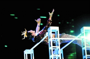 郭富城在3米高的鋼架作出的“托馬斯全旋”的體操動作。時報記者 龍成關 攝