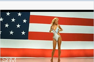 在《帕麗斯選總統(tǒng)》的MV里,帕麗斯身穿泳裝,背景則是美國星條旗。
