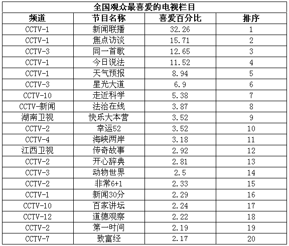 觀眾最喜愛的電視欄目的前20名,有18個是中央電視臺的欄目,另外兩個是湖南衛(wèi)視的《快樂大本營》和江西衛(wèi)視的《傳奇故事》,分別排在第9位和第12位。