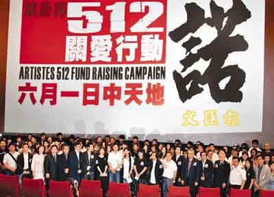 據(jù)香港文匯報報到,昨日近兩百余演藝界人士參加了記者會,短短十五分鐘談話便結束,會上先由活動召集人劉德華發(fā)言,他先為各界的支持致意,華仔又哽咽地說:“四川大地震發(fā)生,演藝界短短時間內(nèi)發(fā)起行動,大家勞心勞力,但這份熱情不是一時三刻,重建需時要三、五、七年,重建災民的生活,是我們的承諾,我特別多謝中聯(lián)辦及香港電影發(fā)展基金于行動中的協(xié)助,以及西九龍中天地六月一日借出場地舉行賑災大匯演,由于時間倉卒,不夠時間向有關政府部門申請,但深信活動會得到大家的響應及支持,寄望天佑四川,天佑中國。”