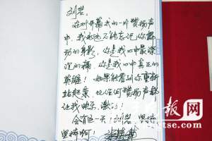 細心詢問病情,關(guān)心治療情況,三大導(dǎo)演在問候劉巖之后,不斷地勉勵這位著名的舞者增強與病魔作斗爭的信念。張藝謀還特別帶來了他在四張節(jié)目單和紀(jì)念冊上贈給劉巖的題字: