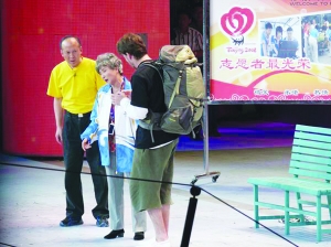 情節(jié):北京奧運會期間,蔡明十分羨慕志愿者。她遇見了穿著志愿者服的郭達,于是纏著他,要跟他一起幫助來北京的客人。兩人遇見了急著找?guī)捻n國小伙子,因為聽不懂小伙子說啥,折騰了半天才明白過來,直把小伙子急得捂著小腹,滿地亂跳。接著兩人遇見了迷路的美國小伙子。美國小伙子只會說簡單的中文,郭達只會說Welcome to beijing這么一句外語,于是又是一陣瞎鬧騰。蔡明指手畫腳,希望用肢體語言讓小伙子明白各種地名,但越搞越亂。此時,真正的志愿者上場,原來郭達只是穿了人家晾在外面的志愿者服。蔡明、郭達失落之時,遇見走失了新郎的新娘,兩人想盡辦法幫她找到了新郎,十分高興,最后大家邊為觀眾發(fā)喜糖邊退場,喜氣十足。