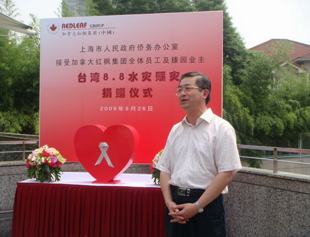 8月26日上午,上海市政府僑辦接受加拿大紅楓集團(tuán)向臺灣受災(zāi)地區(qū)捐贈儀式在臻園別墅舉行。加拿大紅楓集團(tuán)董事長周正寬先生、馬絢華女士代表集團(tuán),通過上海市政府僑辦向臺灣受災(zāi)地區(qū)捐款人民幣30萬元。副總經(jīng)理丁道恒等代表全體員工捐款人民幣1.7余萬元。臻園別墅業(yè)主也在活動現(xiàn)場進(jìn)行了捐款。上海市政府僑辦主任崔明華出席活動并講話。