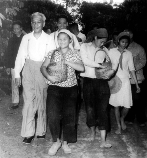 畫(huà)面上,曾六妹(前方穿花格衣服者)和她的同學(xué)張桂嬌提著滿藍(lán)的咖啡果走在前面,兩人還不時(shí)交流勞動(dòng)心得,而劉少奇則像一位和藹的長(zhǎng)者,慈祥地跟在她們身后。