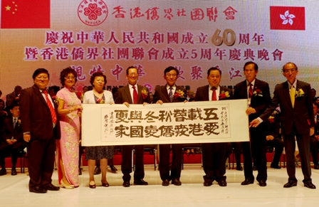 中新網9月29日電 9月24日晚,香港僑界社團聯會在香港伊利沙白體育館舉辦慶祝中華人民共和國成立60周年暨香港僑界社團聯會成立5周年慶典,香港特區(qū)行政長官曾蔭權、中央政府駐港聯絡辦主任彭清華、副主任黎桂康、外交部駐港特派員公署特派員呂新華、全國政協(xié)港澳臺僑委員會副主任林兆樞、國務院僑辦副主任許又聲、中國僑聯副主席王永樂以及香港各界僑胞近3000人出席了慶典。