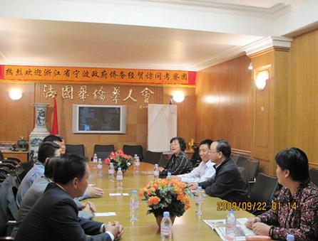 在法國期間,訪問團(tuán)拜訪了法國華僑華人會,F(xiàn)任主席陳勝武及副主席張過祥、陳其躍等負(fù)責(zé)人,熱情接待了訪問團(tuán),相互進(jìn)行了座談;訪問團(tuán)還參觀了位于巴黎市中心四區(qū)的會所、文化中心,及中華文化學(xué)校。通過座談參觀,訪問團(tuán)了解到,近年來,隨著中國國力迅速增長,旅法華人地位不斷提高,華人也在改變過去不關(guān)心政治的慣例,正在努力融入當(dāng)?shù)刂髁魃鐣。訪問團(tuán)與法國華僑華人會互贈了禮品;法國歐華歷史學(xué)會會長葉星球還向訪問團(tuán)贈送了其撰寫的《法國華人三百年》一書。