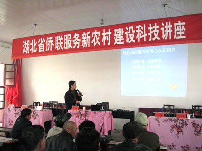 中新網(wǎng)12月4日電 據(jù)湖北僑聯(lián)網(wǎng)消息,近日,湖北省僑聯(lián)組織的服務(wù)新農(nóng)村建設(shè)“科技講座”活動(dòng),分別在老河口和天門市舉辦。此次活動(dòng),邀請了華中農(nóng)業(yè)大學(xué)植物科技學(xué)院和水產(chǎn)學(xué)院5名專家教授,分別就“梨的主要病蟲害及其防治”、“果樹優(yōu)質(zhì)栽培技術(shù)及實(shí)際操作”、“水產(chǎn)養(yǎng)殖和除病”等方面的知識(shí)進(jìn)行了專題講座,來自老河口市和天門市各鄉(xiāng)鎮(zhèn)共160多名農(nóng)業(yè)站長、技術(shù)員和養(yǎng)殖專業(yè)戶聽取了科技講座。此次活動(dòng),受到了當(dāng)?shù)剞r(nóng)民的熱烈歡迎。