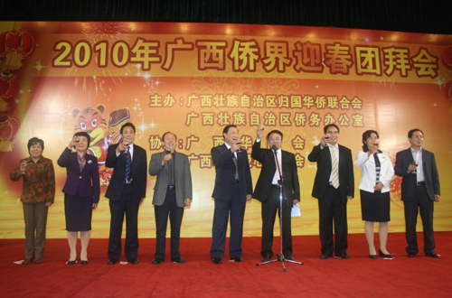 中新網(wǎng)2月20日電 據(jù)廣西僑聯(lián)消息,日前,2010年廣西僑界迎春團(tuán)拜會(huì)在南寧市明園飯店隆重召開(kāi)。本次團(tuán)拜會(huì)由廣西自治區(qū)僑聯(lián)、自治區(qū)僑辦主辦,廣西華商會(huì)、廣西華僑愛(ài)心基金會(huì)協(xié)辦。