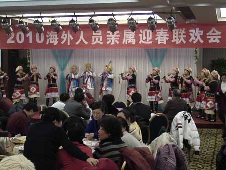 由澳洲海外親屬自行排演的15人的葫蘆絲演奏拉開文藝節(jié)目演出的帷幕。精彩的節(jié)目給觀眾以美好的藝術享受。演出期間還穿插了各片區(qū)海外親屬會員集體對海外游子的美好祝福。20個形式多樣的文藝節(jié)目全部由海外親屬自排自演,充分展示了他們的才華。
