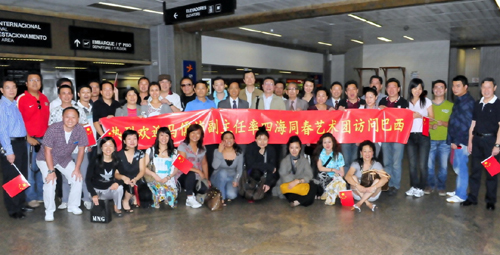 當(dāng)天在中國駐圣保羅總領(lǐng)事孫榮茂,巴西華人協(xié)會會長吳耀宙及各位僑領(lǐng)的帶領(lǐng)下,當(dāng)?shù)氐膬S胞們來到國際機(jī)場迎接藝術(shù)團(tuán),大家都手握國旗,拉著大橫幅,滿懷激情的等待著,當(dāng)藝術(shù)團(tuán)演員們出現(xiàn)在大家眼前時,許多熟悉的面孔都掛滿了笑容,僑胞與藝術(shù)家們相擁著,互相問好。