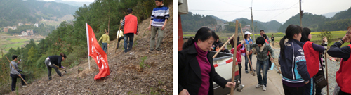 一到植樹地點,大家就扛起工具,三四人一組,分工協(xié)作,你一鍬我一鏟,挖坑、種樹、填土,干的熱火朝天,經(jīng)過義工與當(dāng)?shù)卮迕竦墓餐,共種下杉木苗1500多株。(馮振武 姜玲菊 )