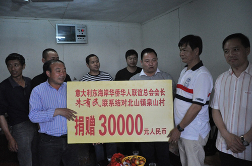 中新網(wǎng)5月28日電 據(jù)青田縣僑聯(lián)消息,5月26日,浙江省青田縣委常委、縣委辦公室主任楊雷陪同青田籍華僑、意大利東海岸華僑華人聯(lián)誼總會會長朱有民,來到聯(lián)系其結(jié)對的北山鎮(zhèn)肖山村和泉山村,分別向兩村各捐贈3萬元共計6萬元,用于改善村莊的基礎設施建設。